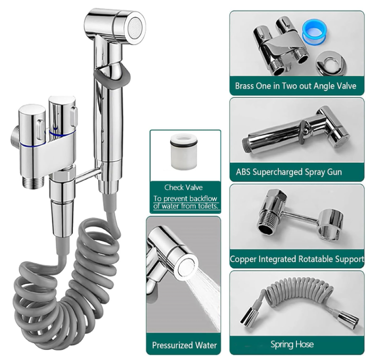 Pulverizador de bidé de mano: la válvula de c" doble está hecha de acero inoxidable 304 de alta calidad y latón y el pulverizador de bidé está hecho de plástico de alta calidad, asegurando resistencia al óxido, durabilidad y seguridad. Esto garantiza una vida útil más larga del producto mientras te proporciona tranquilidad durante el uso.